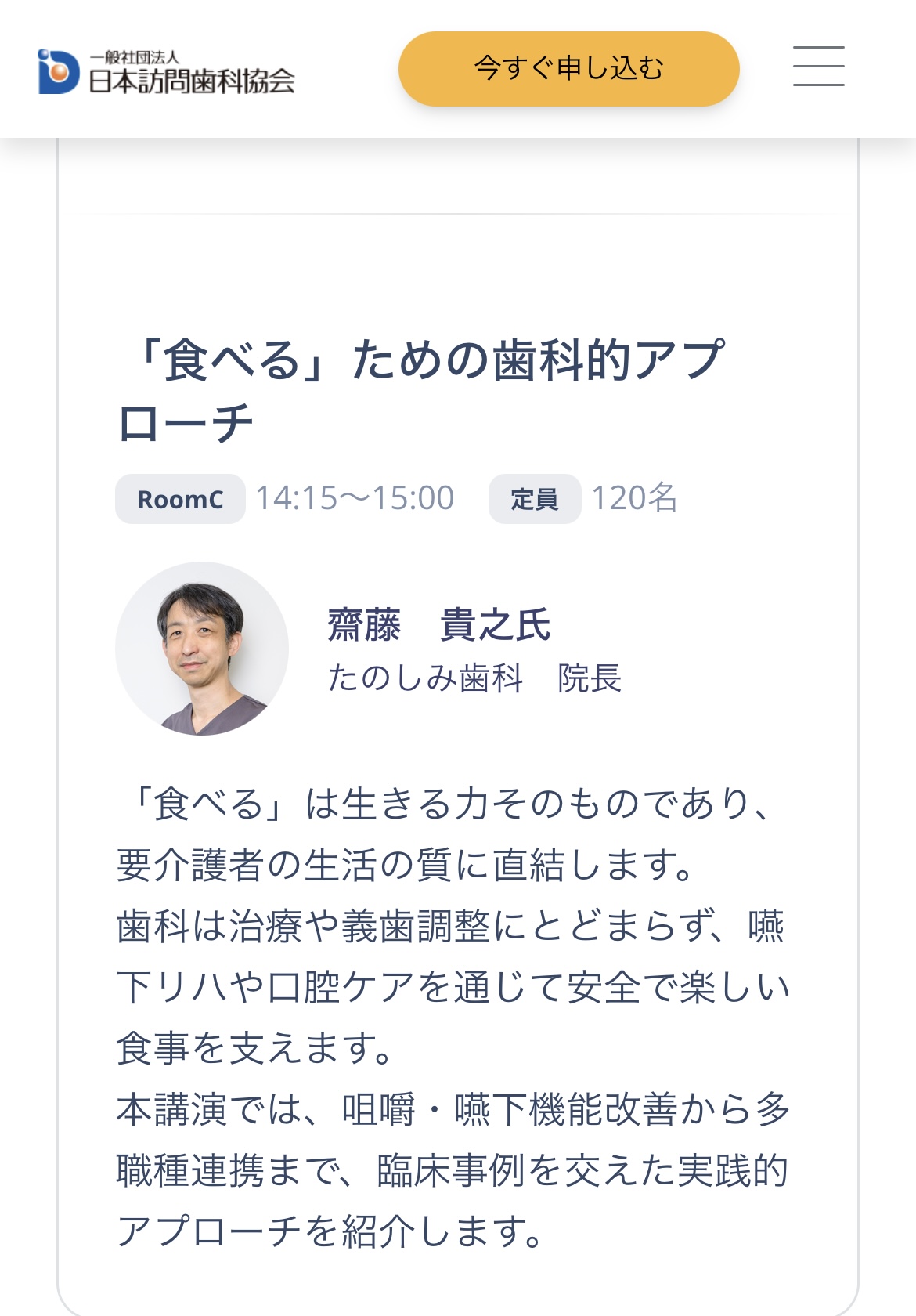 11月2日に開催された訪問歯科協会の学会で院長の齋藤がシンポジストを務め、【「食べる」ための歯科的アプローチ】と題した講演を行いました。
